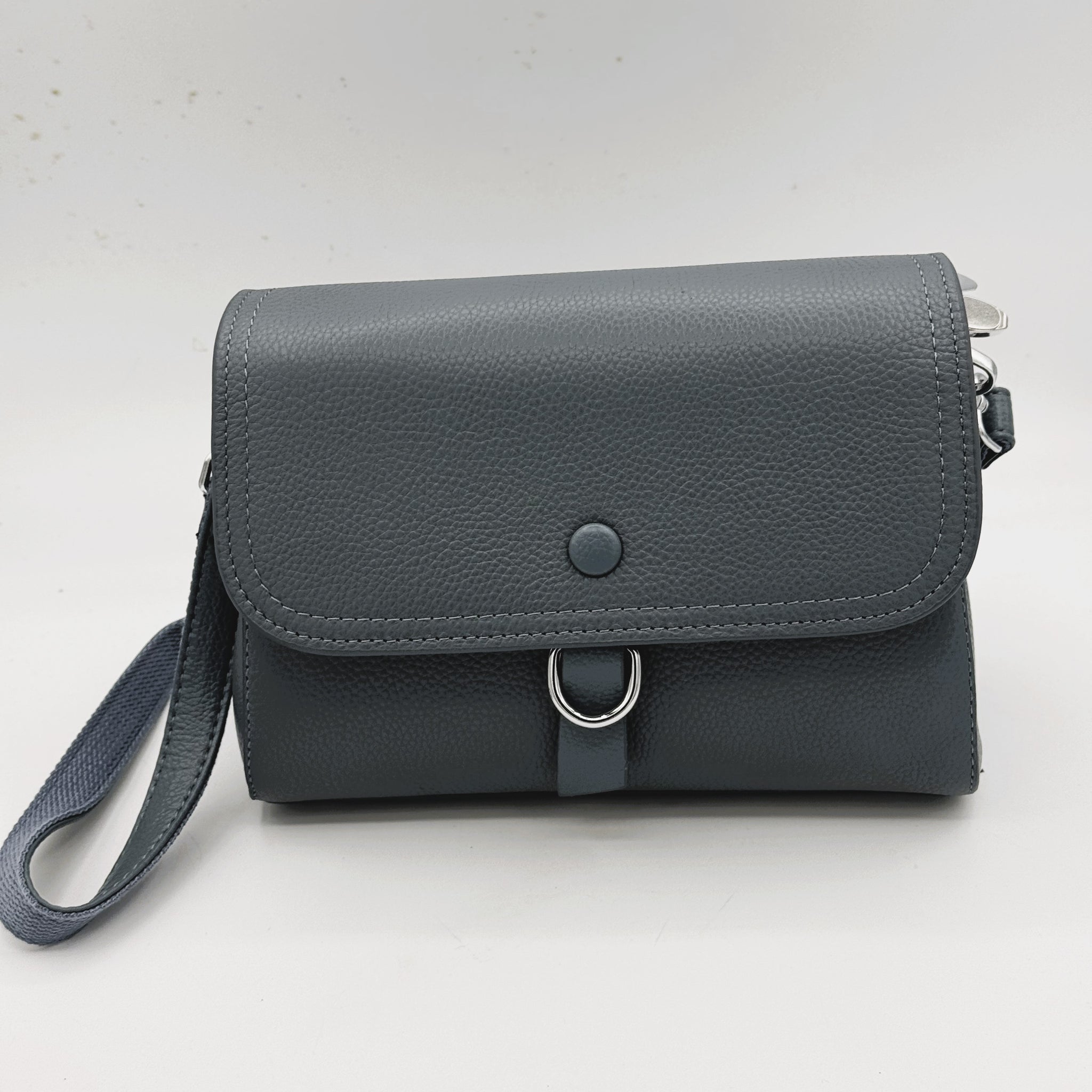 Blue bag with two compartments inside, each with an internal pocket, one zipped. A mag dot flap secures the bag.