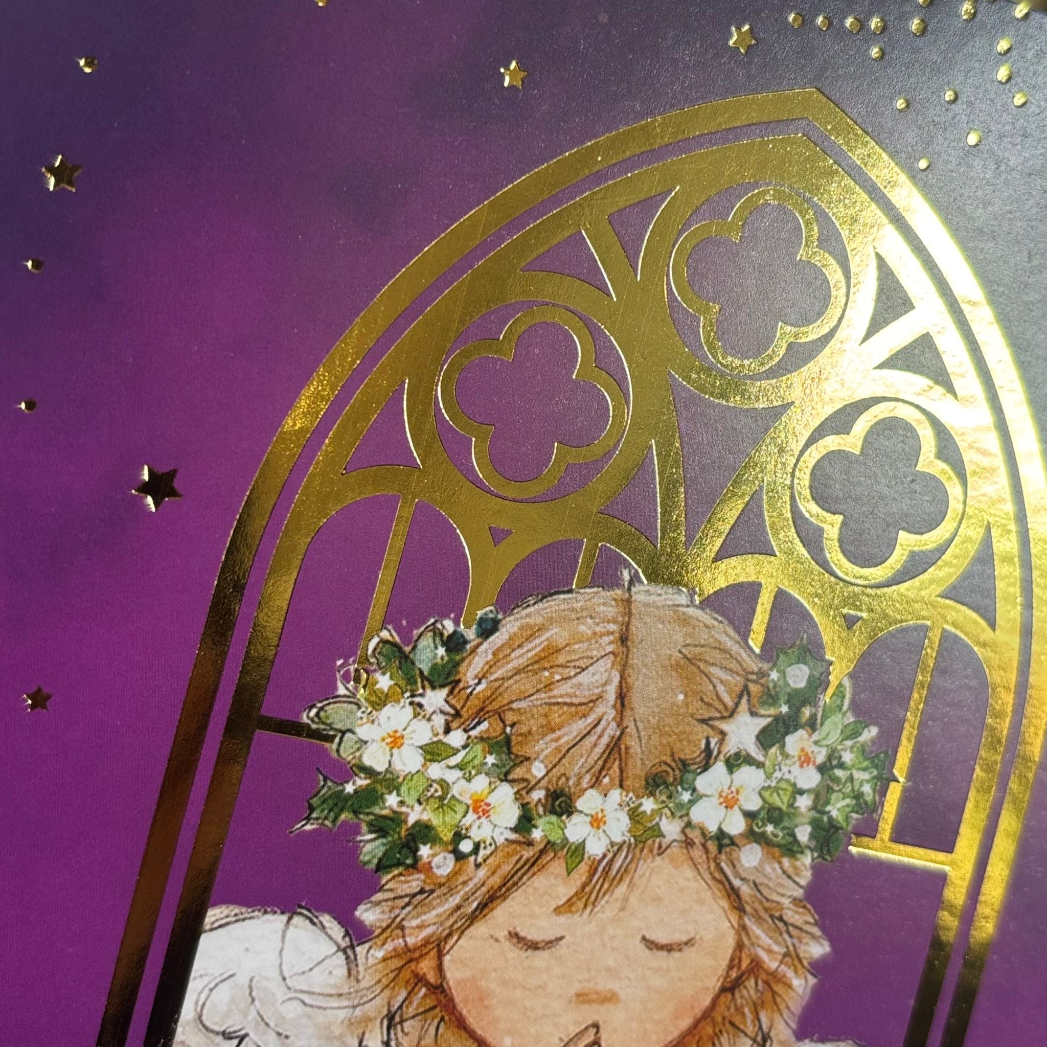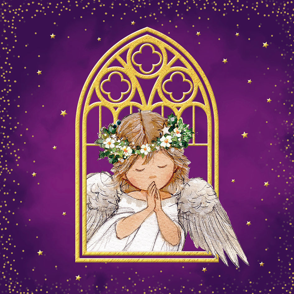 A pack of 10 Christmas cards featuring an angel praying at a window, with the following message inside: