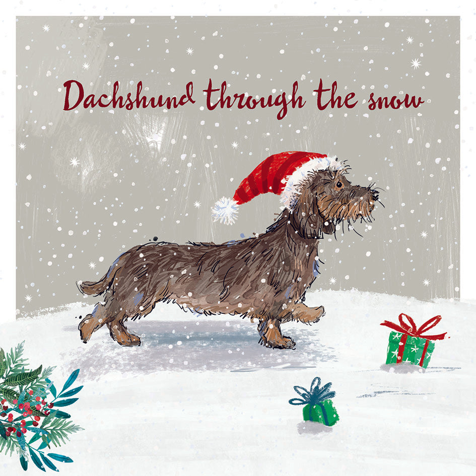 A pack of 10 Christmas cards featuring a cute dachshund trotting through the snow, with the following message inside: