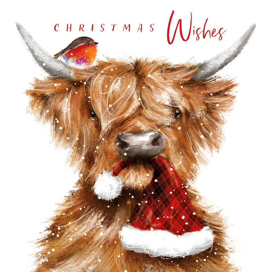 A pack of 10 Christmas cards featuring a highland cow with a robin perched on its horn, with the following message inside: