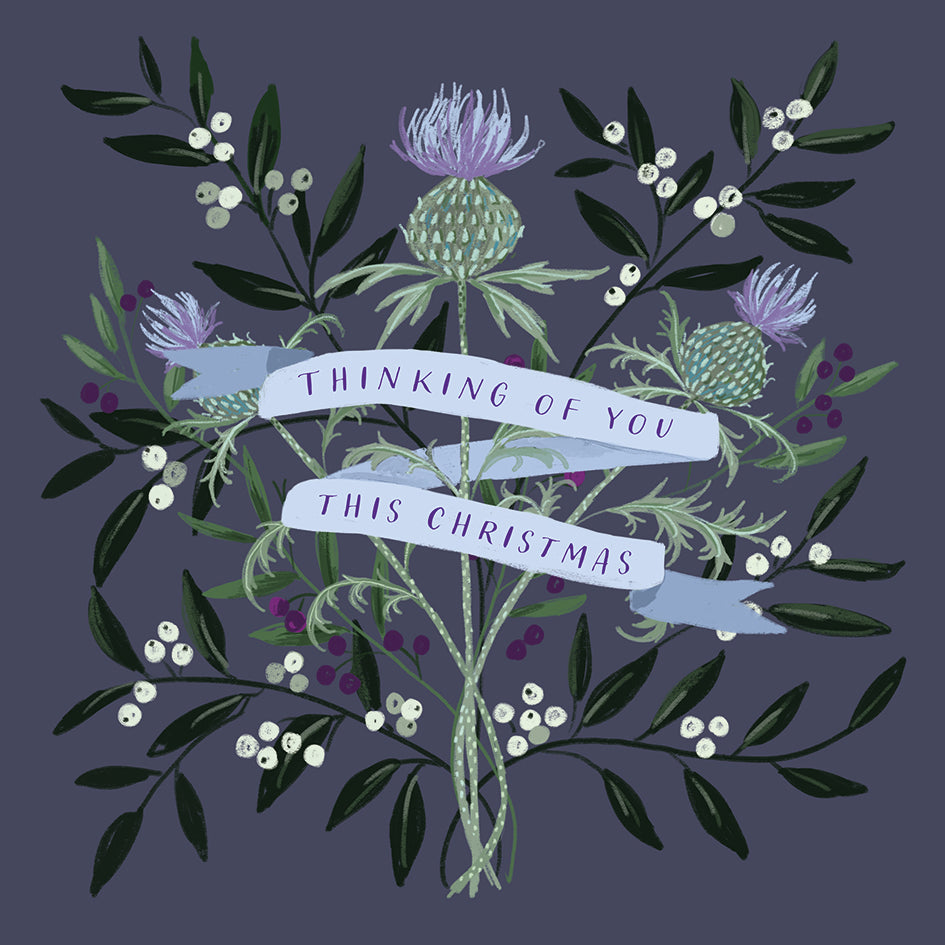 A pack of 10 Christmas cards featuring thistle foliage and "Thinking of you this Christmas", blank inside for your own message.