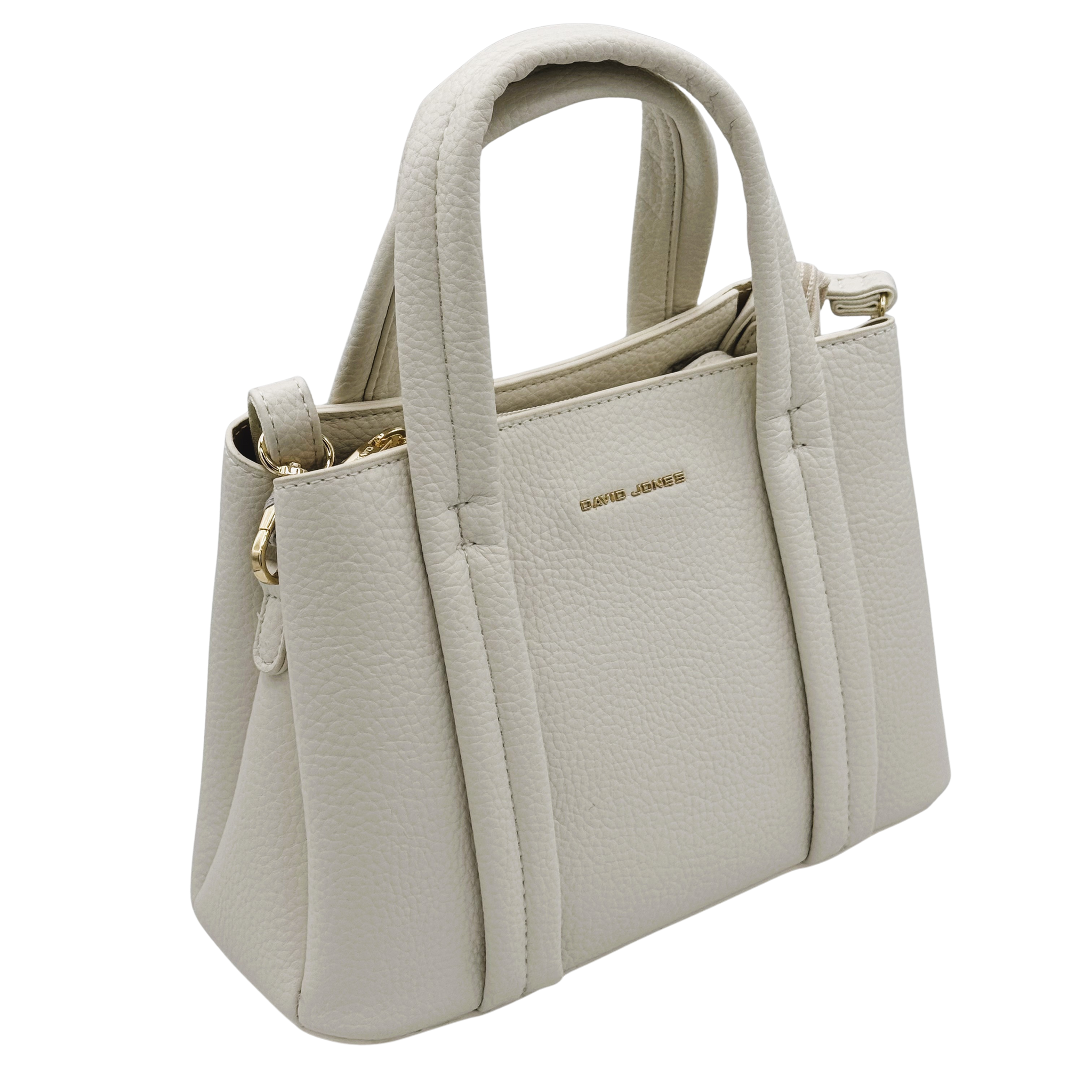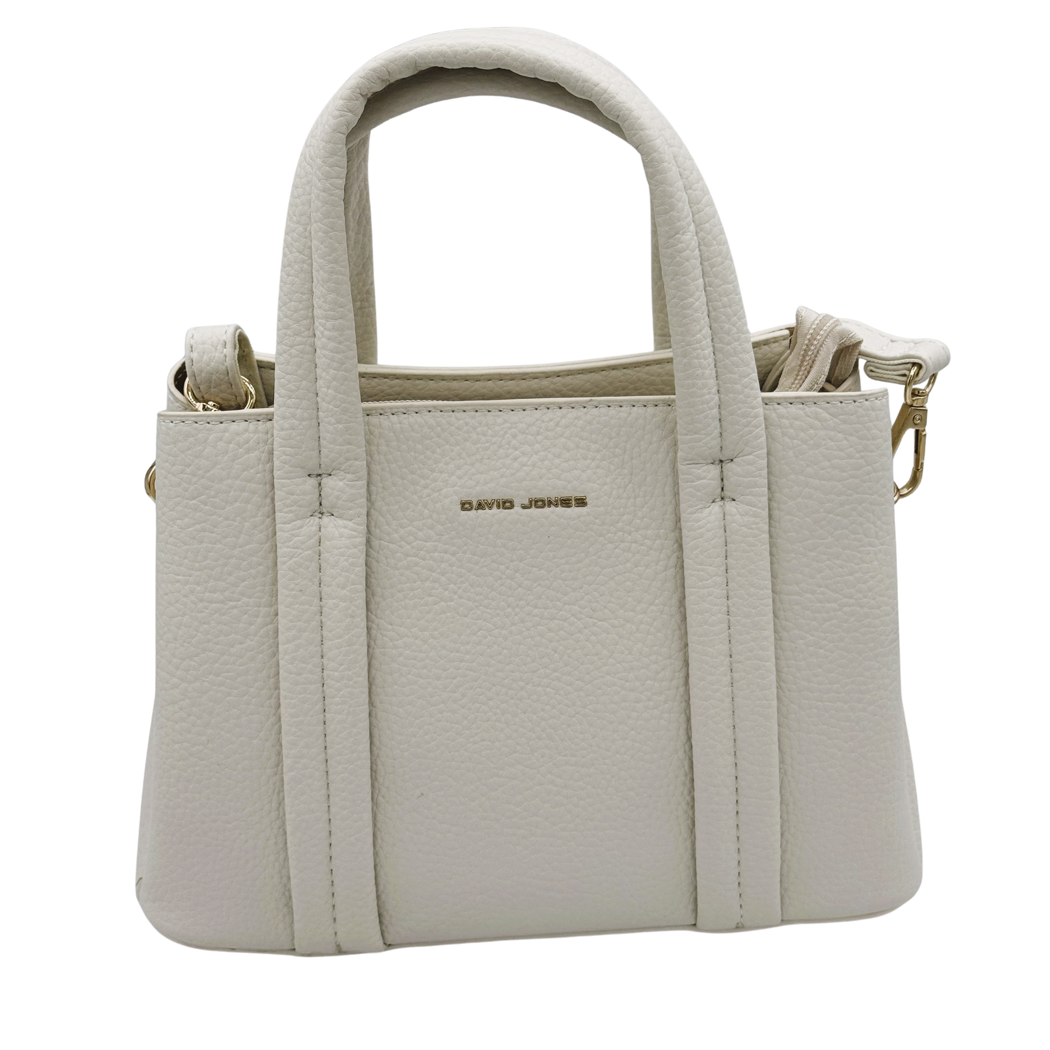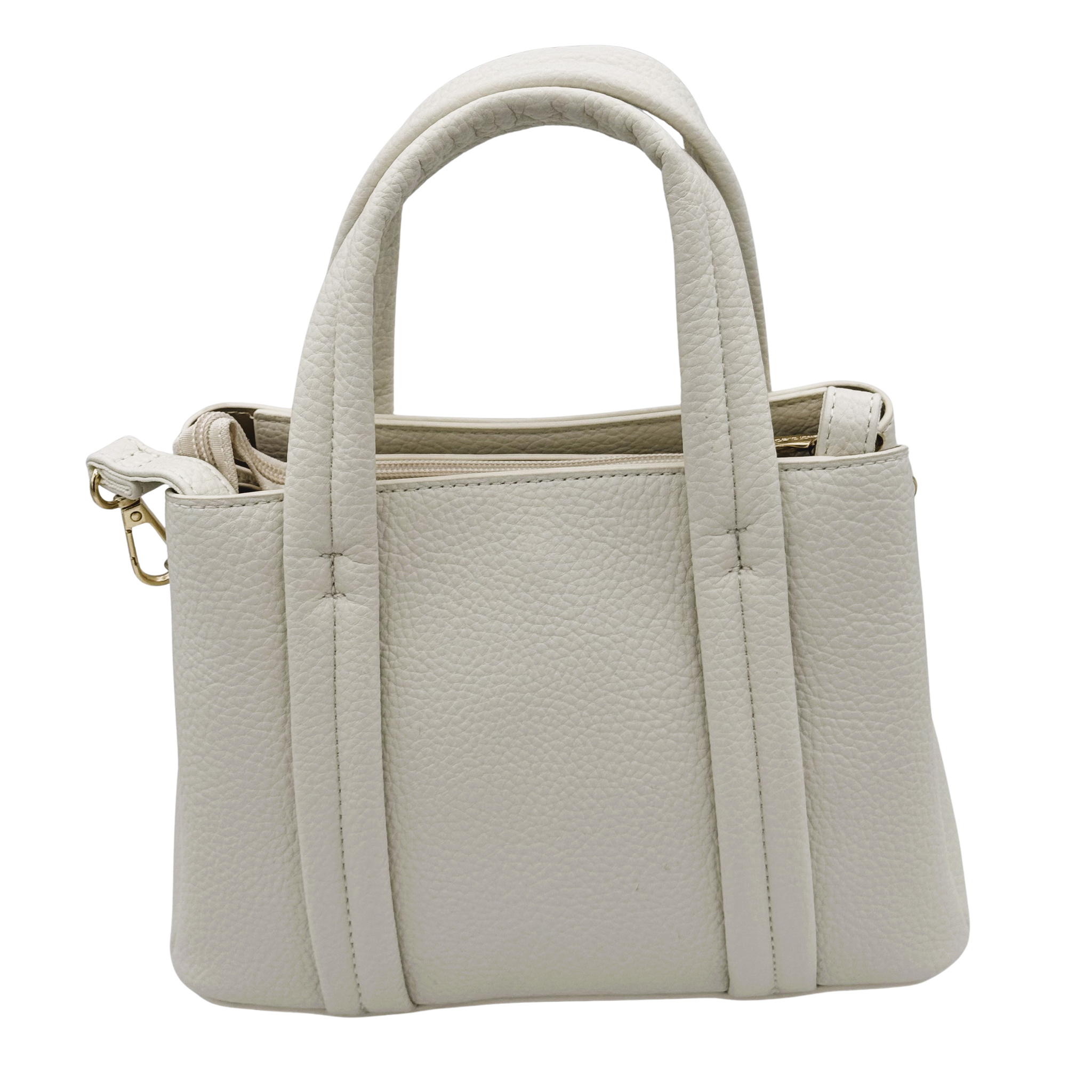 This lovely cream handbag has a zip top compartment and two internal pockets (one open, one zipped) and an adjustable/detachable strap. Made from vegan leather.