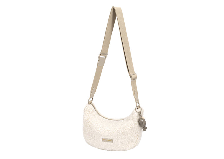 This lovely beige faux sheepskin shoulder bag has a zip top and two internal pockets (one open, one zipped) plus an adjustable strap.
