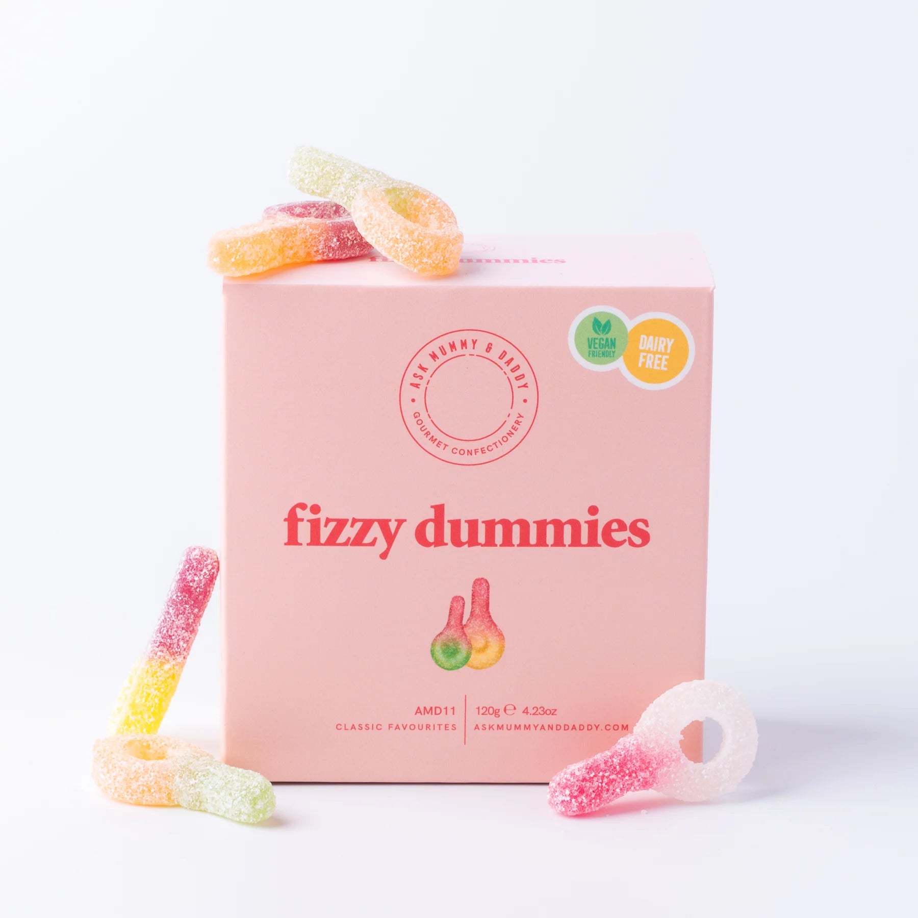 Get ready to enjoy the fun and flavour of our gourmet Fizzy Dummies! Each chewy piece is packed with a delightful mix of sweet and tangy flavours, with a fizzy twist that makes every bite exciting. These colourful treats are dusted with a light coating of sugar, adding an extra layer of yumminess.