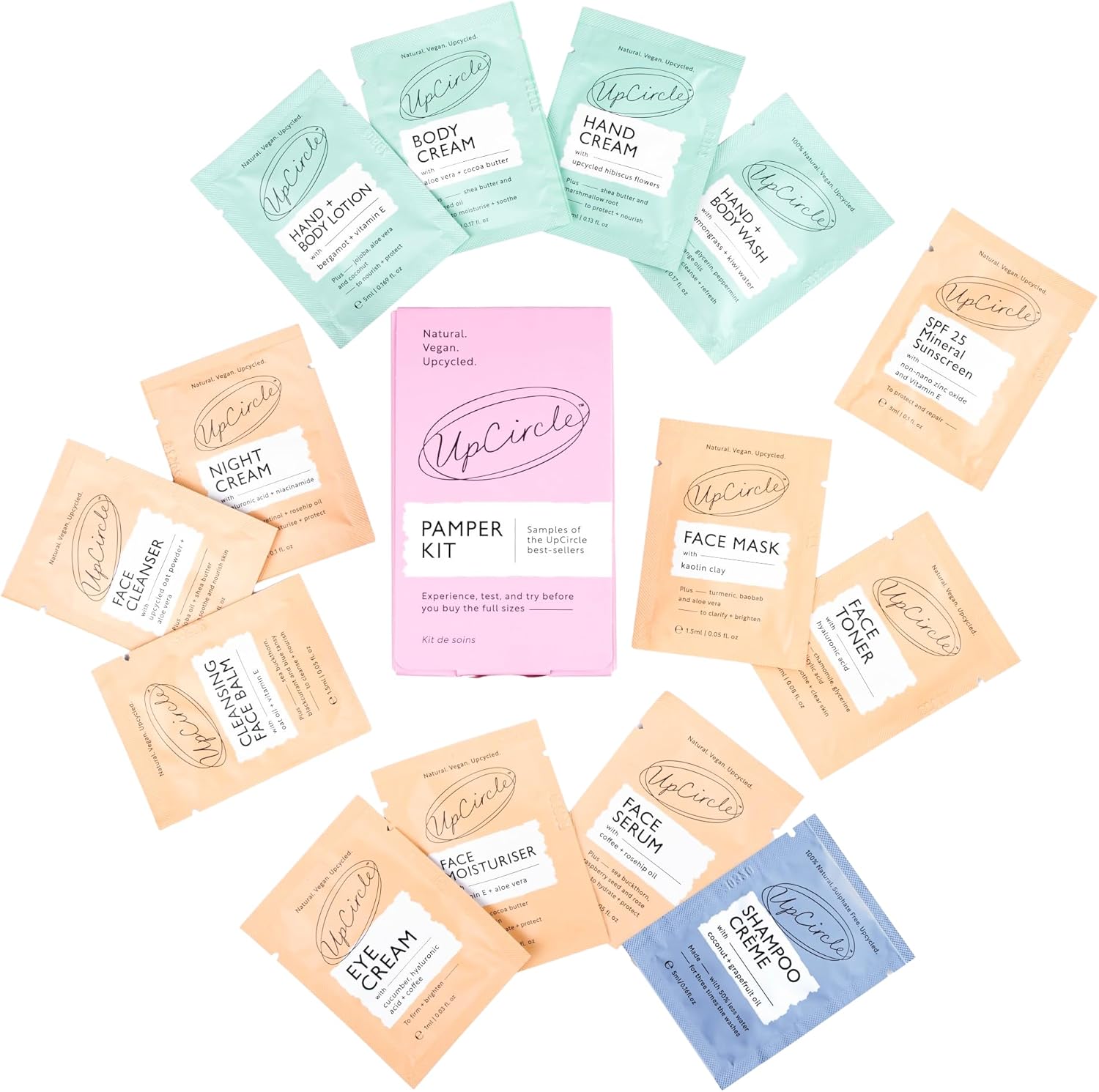 A pamper kit from Upcircle Beauty containing 17 sample-sized products from the Upcircle Beauty range. Perfect for trying out different products, and great to share with friends at a pamper party.