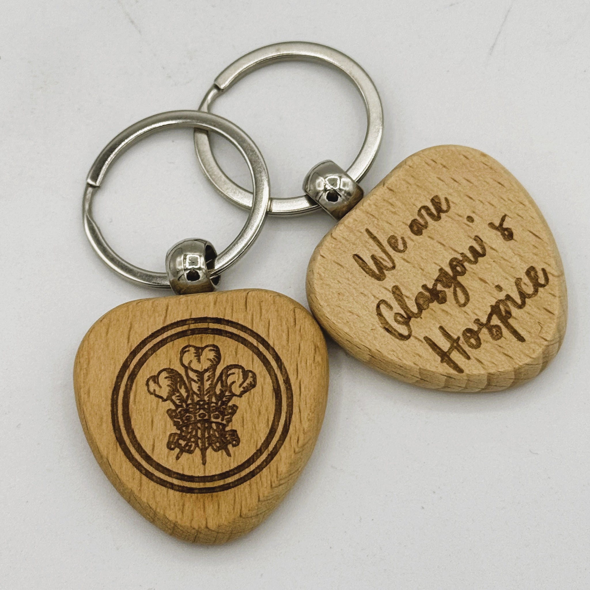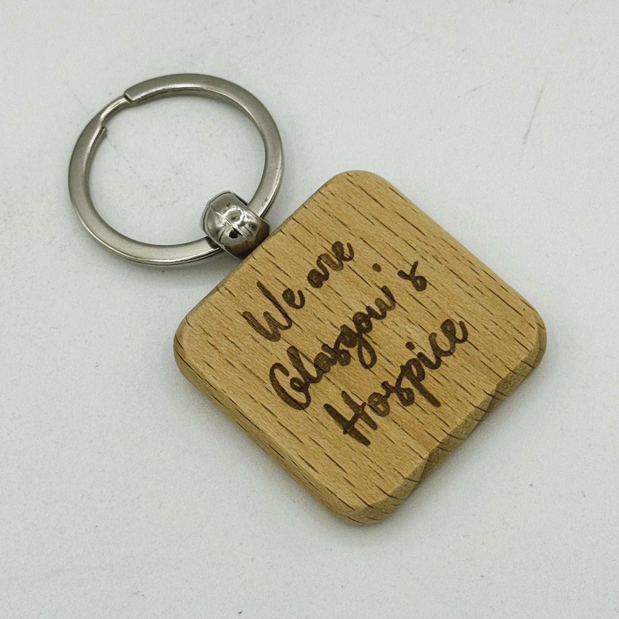 Handmade wooden keyrings from a local crafter, laser engraved with the Hospice crest on one side, and "We are Glasgow's Hospice" on the other.