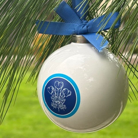Crafted from sturdy white ceramic, each bauble features the PPWH crest and logo, finished with a stylish blue grosgrain ribbon bow.