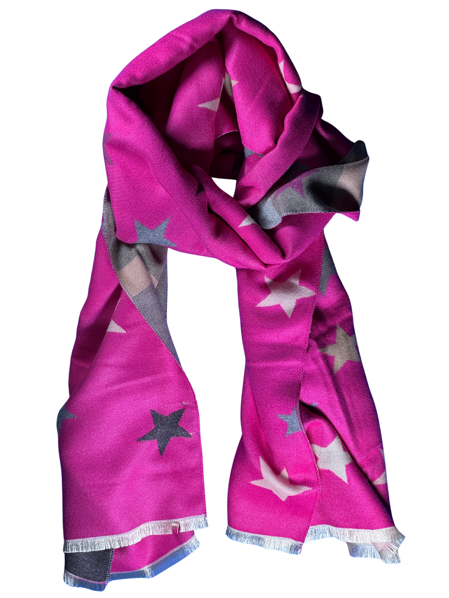 A lovely warm reversible scarf from Peace of Mind, with stars on a fuchsia background on one side, and on a grey striped pattern on the other.