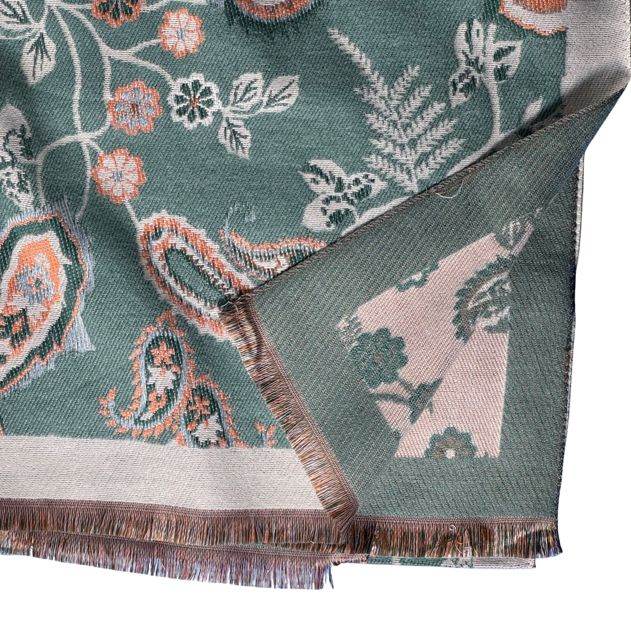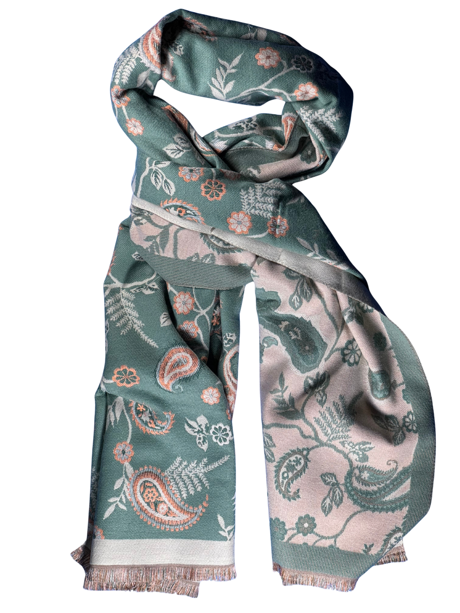 A warm winter scarf from Pure White Accessories, with a green paisley pattern.