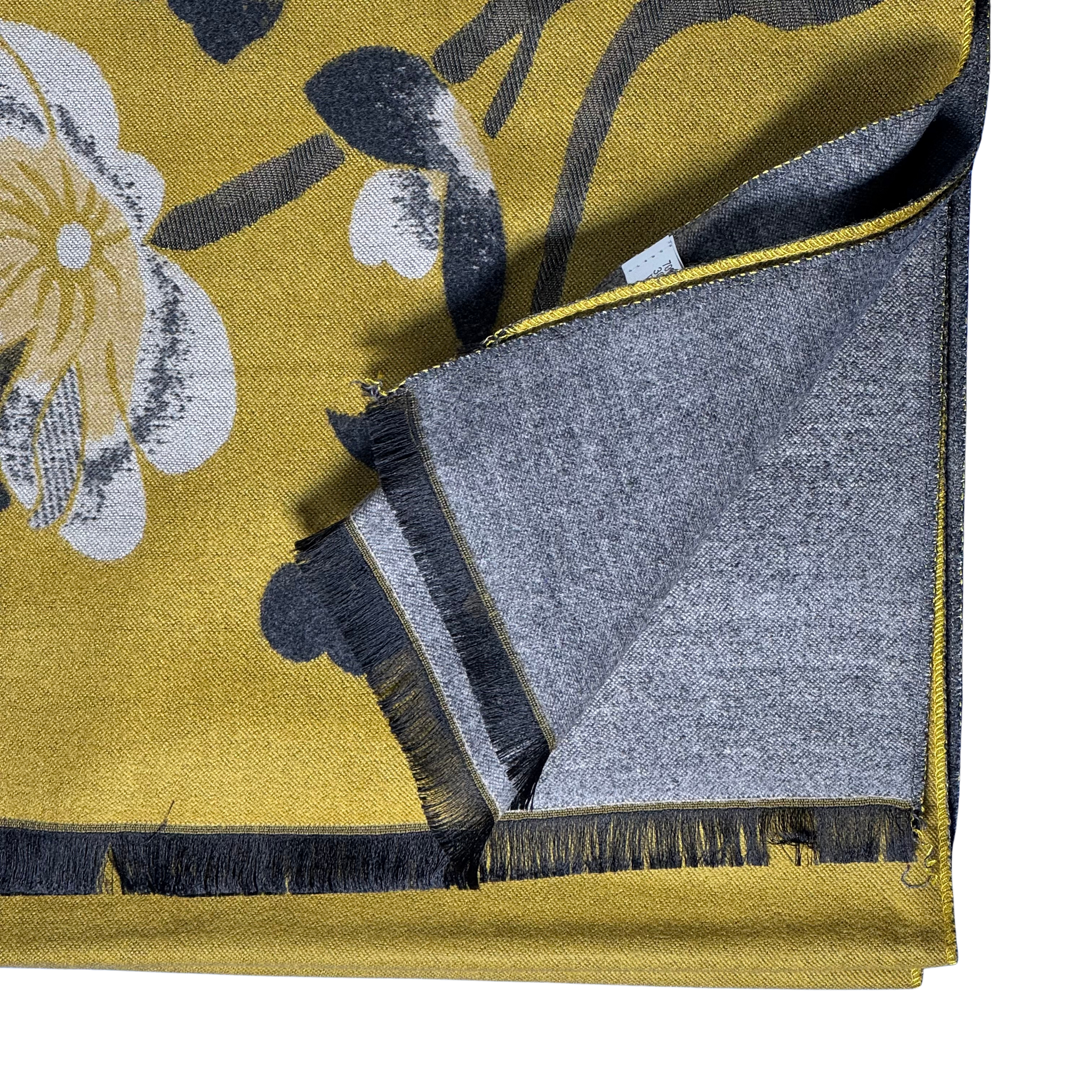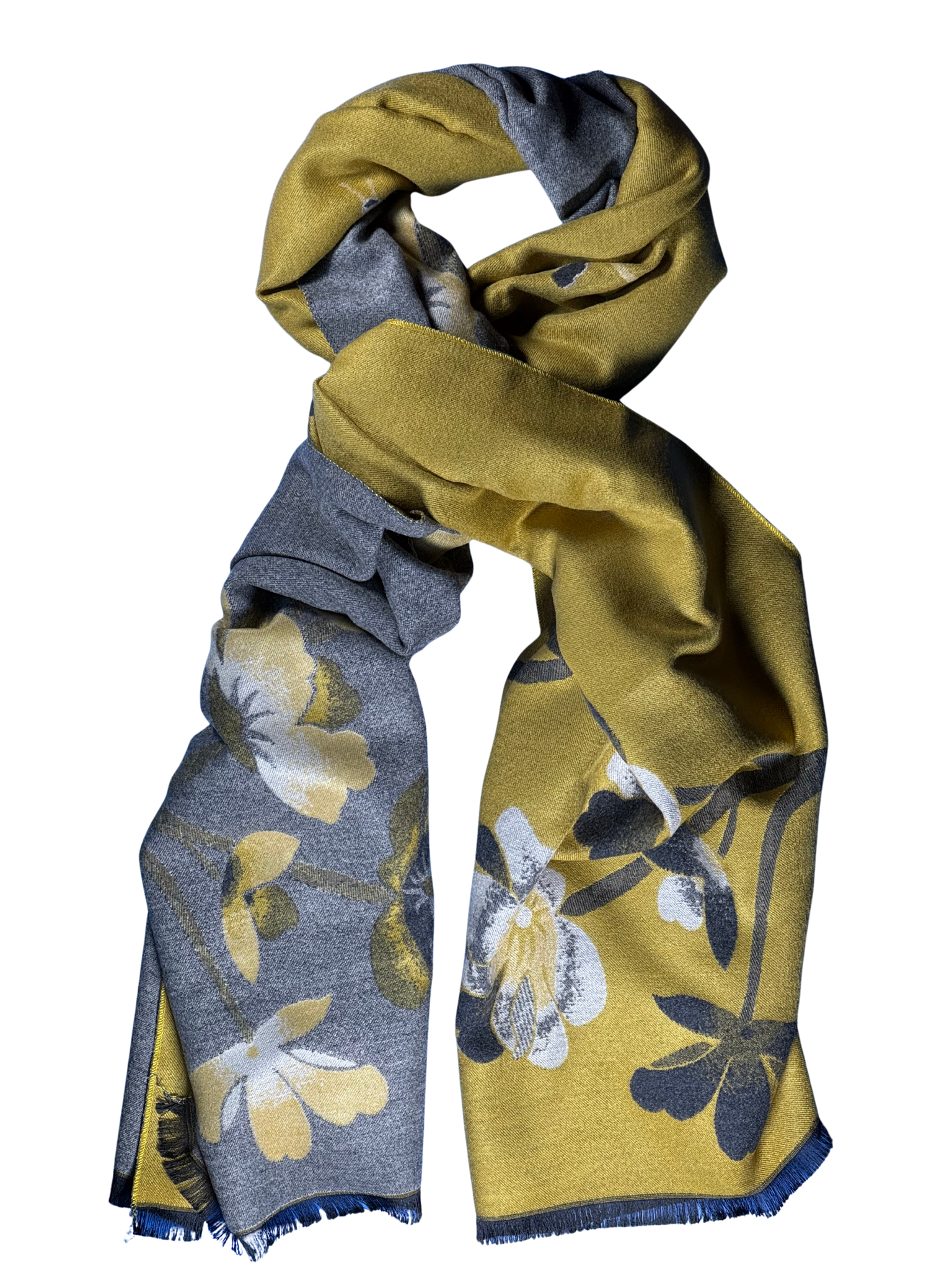 A warm winter scarf from Pure White Accessories, with a flower pattern on a mustard background.