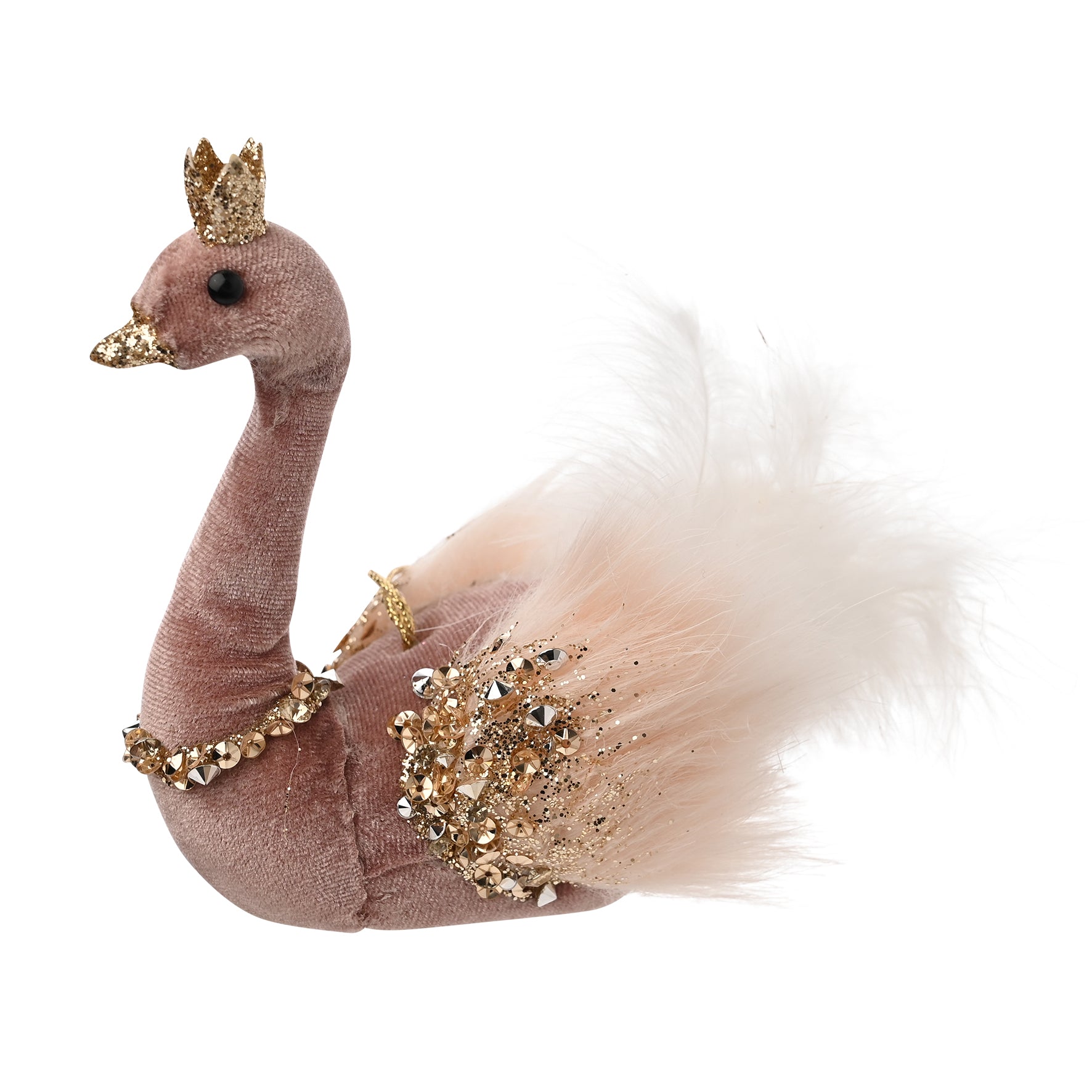 Add a touch of elegance to your Christmas Tree with the Ornate Velvet Regal Swan Hanging Decoration. This opulent piece is crafted with an inviting plush pink velvet body, crowned with sparkling gold accents. Its regal design breathes life into any display.